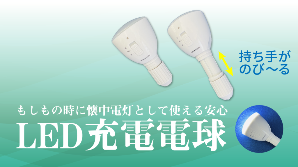 停電などもしもの時に、取り外して懐中電灯して使用できるLED充電電球です。簡単に持ち手が伸び、持ち運びがしやすいため特に女性に人気の商品です。